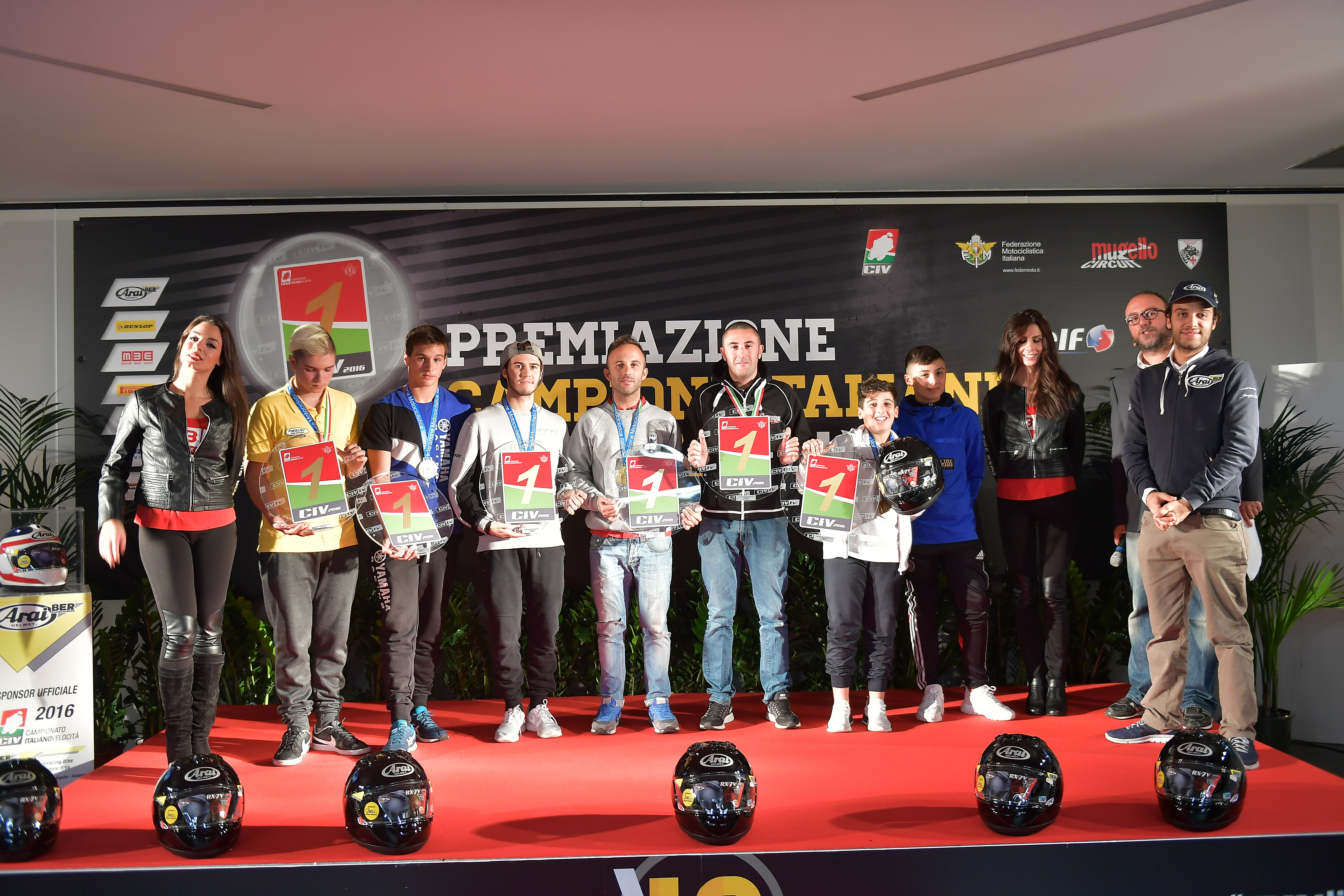 La serata di domenica è stata l’occasione per premiare i primi 3 classificati di ogni classe del CIV oltre che i vincitori delle classifiche speciali (Team Standings, giri veloci, classifica gomme ecc…). In aggiunta alla targa tricolore, i Campioni Italiani 2016 hanno ricevuto dei premi anche da Arai Ber Racing ed Elf. L’azienda specializzata in caschi ha omaggiato i 7 vincitori del CIV 2016 con un casco Arai mentre Elf ha consegnato loro un maxi-assegno per la benzina da competizione omaggio del prossimo anno.